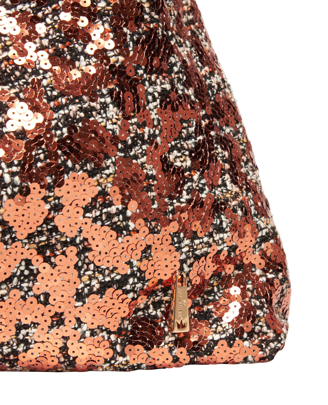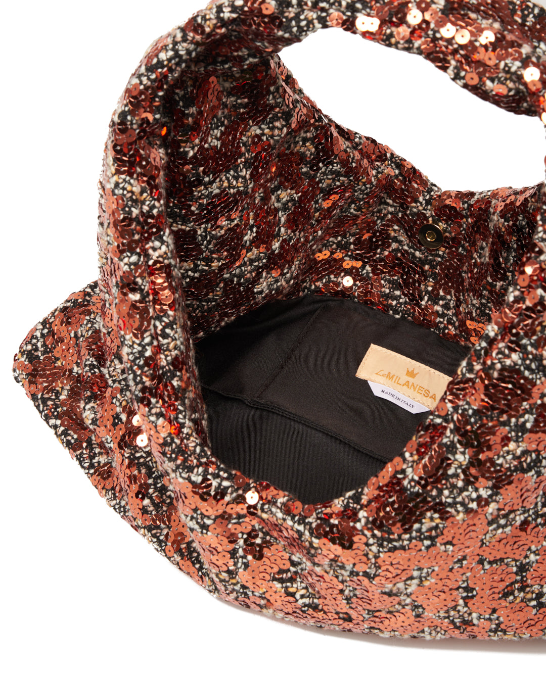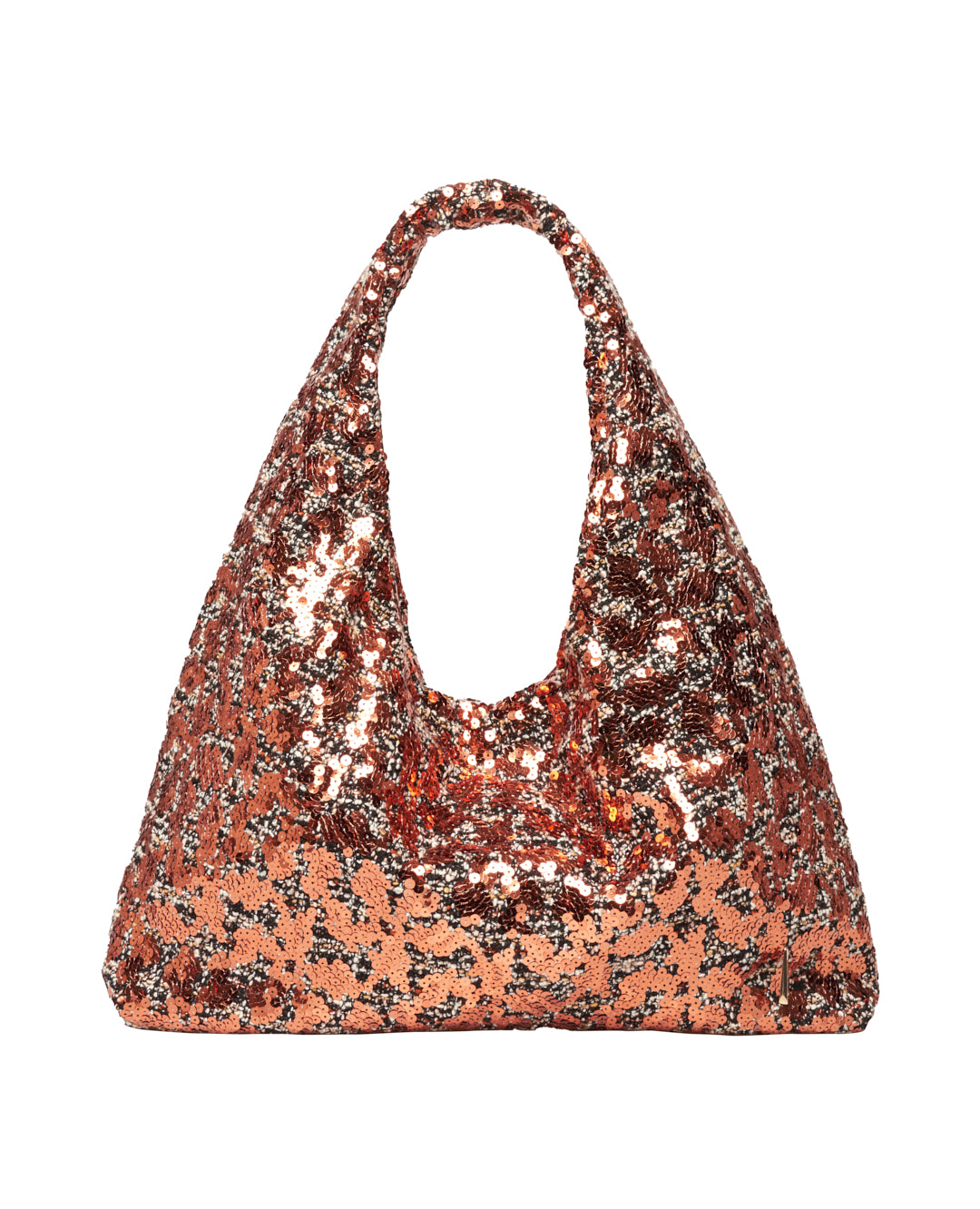 Shopping maxi bag compatta con silhouette triangolare, arricchita da un ricamo di paillettes cangianti. Una borsa capiente ma luminosa, che unisce praticità e stile scintillante.