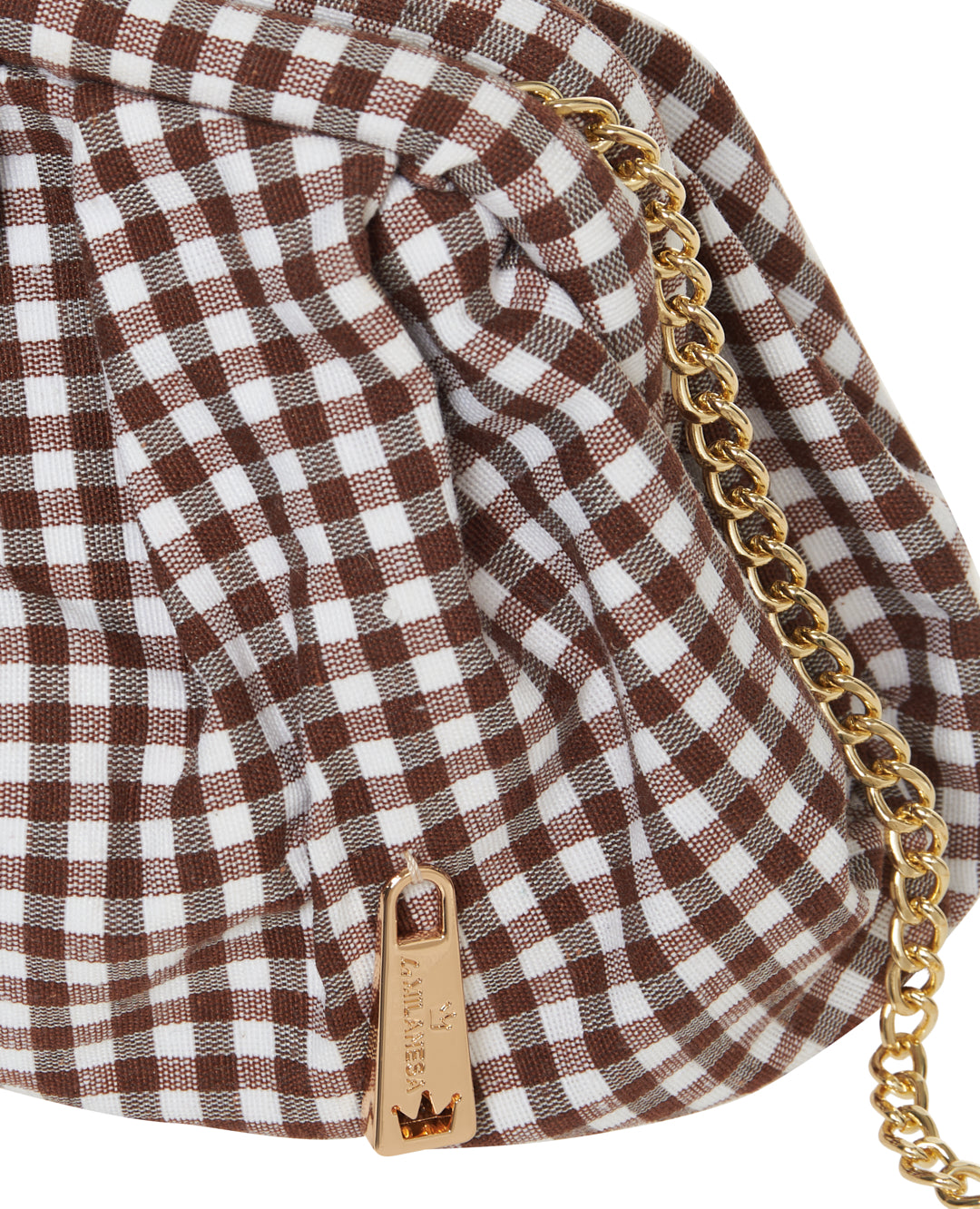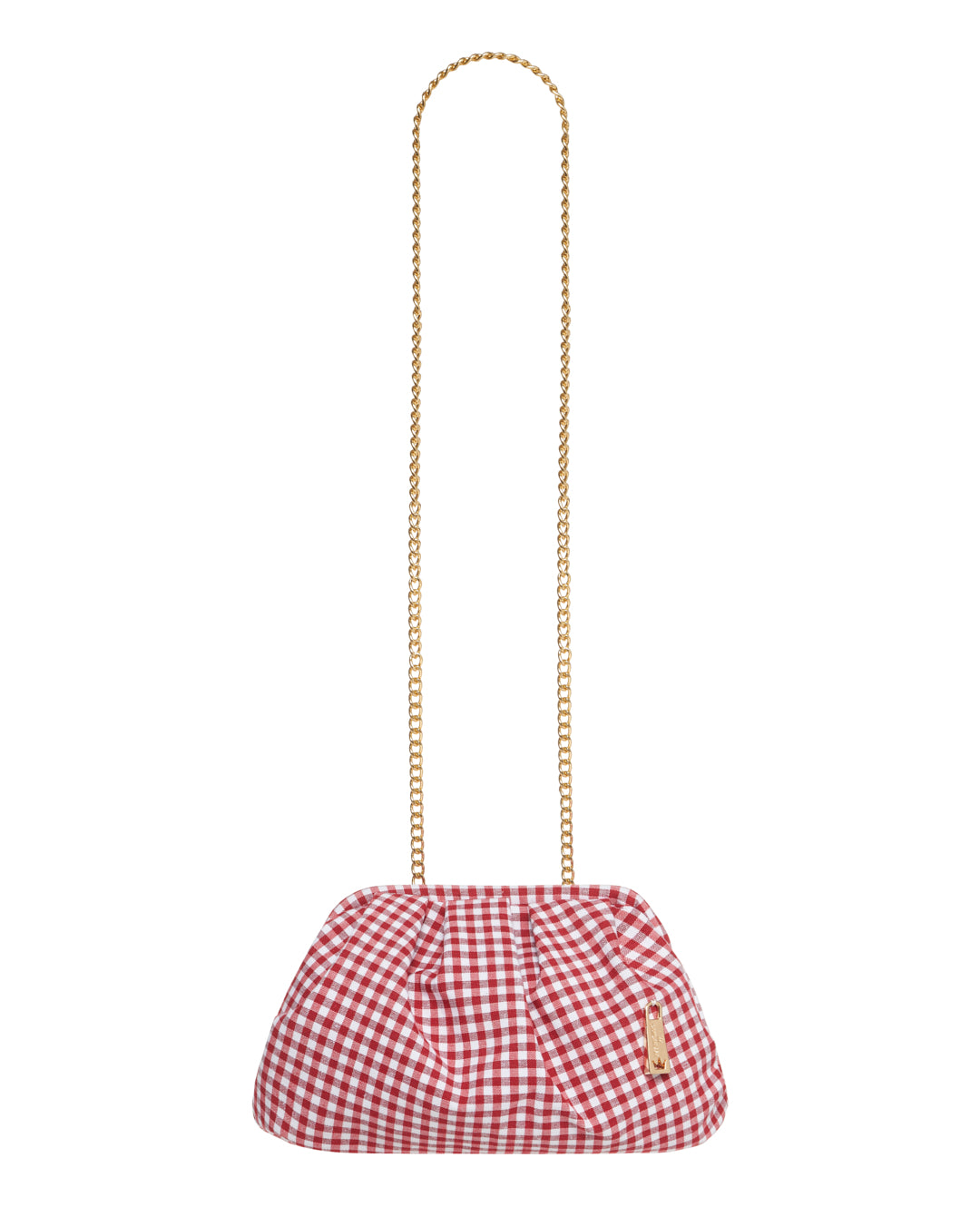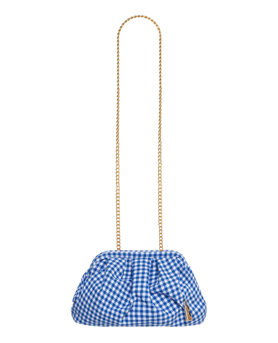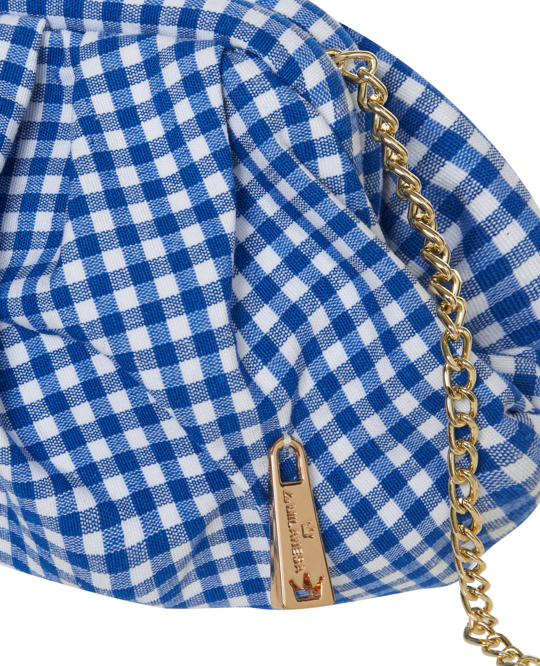 Clutch dal design morbido con tessuto a quadretti. La catena dorata consente una portabilità a spalla o crossbody, rendendola pratica e femminile.