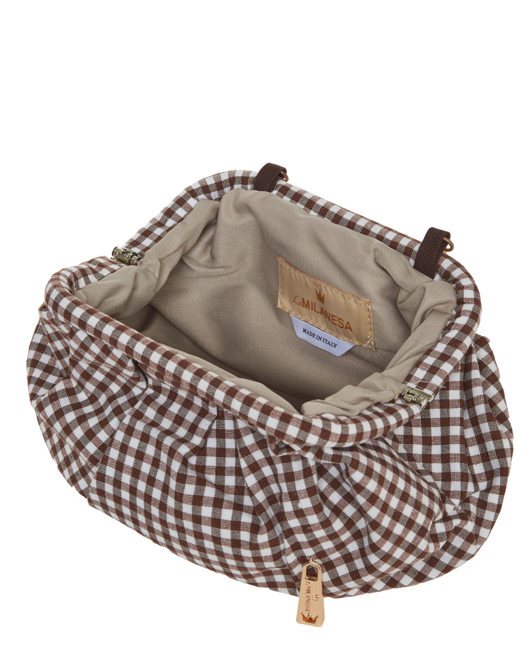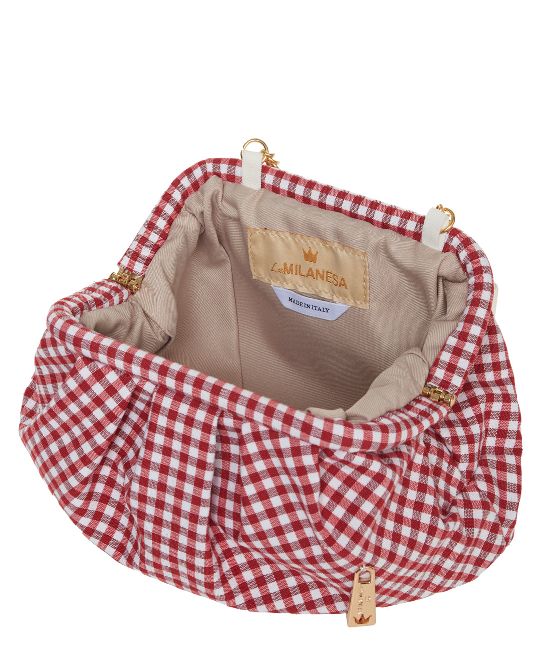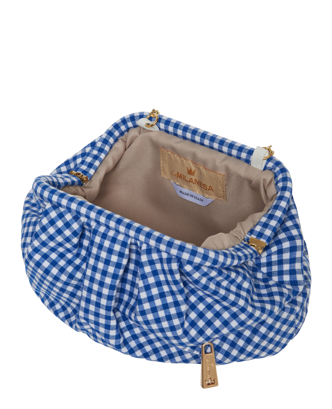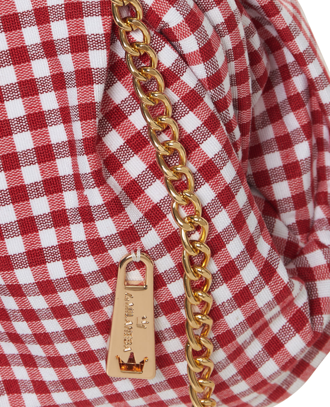 Clutch dal design morbido con tessuto a quadretti. La catena dorata consente una portabilità a spalla o crossbody, rendendola pratica e femminile.