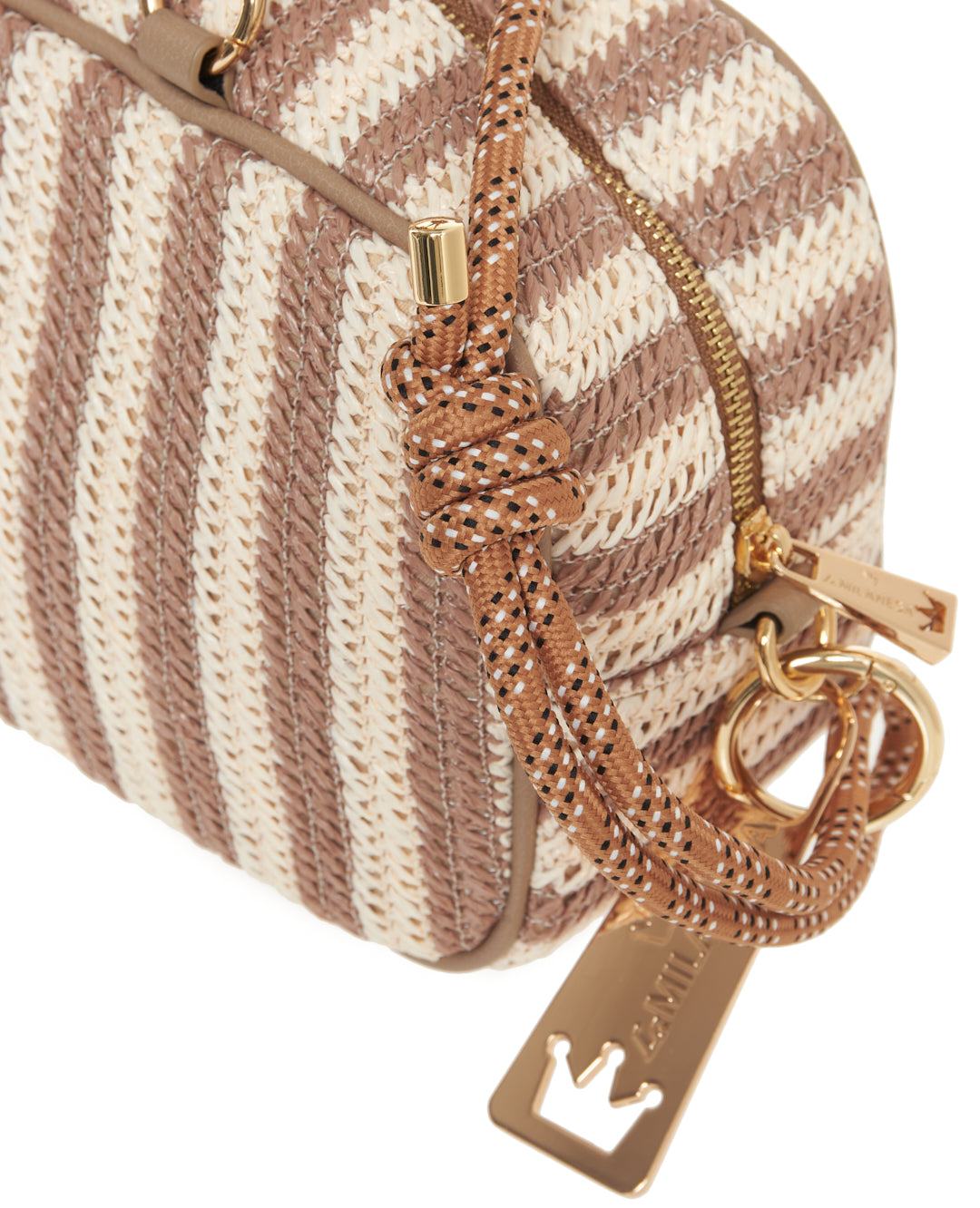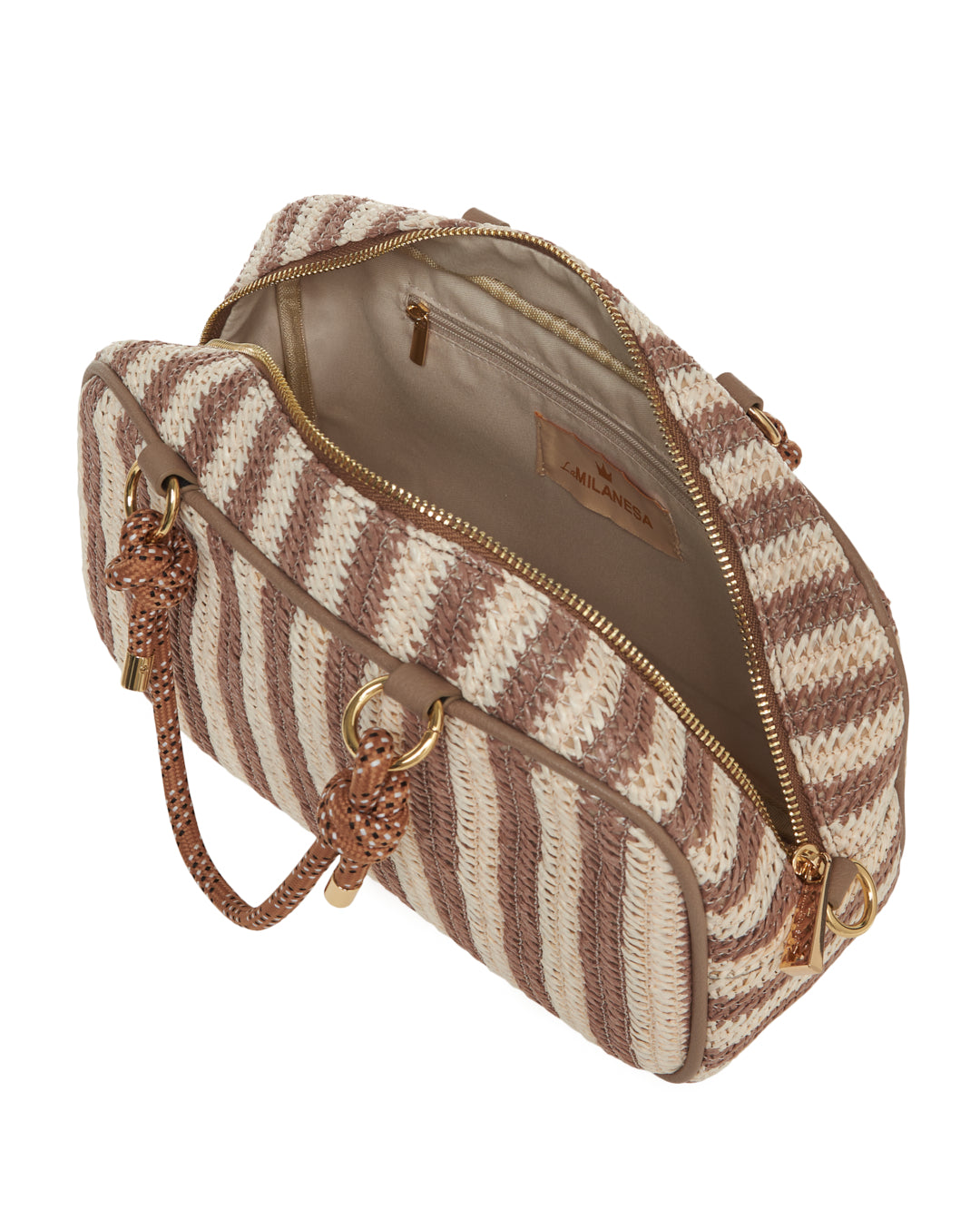 A compact bag with a refined, summery feel, featuring an elegant striped pattern in natural tones. The woven rope handles add a refined, artisanal touch, while the removable shoulder strap allows it to be carried by hand or over the shoulder. It's the ideal accessory to complete fresh, casual-chic looks, perfect from the city to vacation.