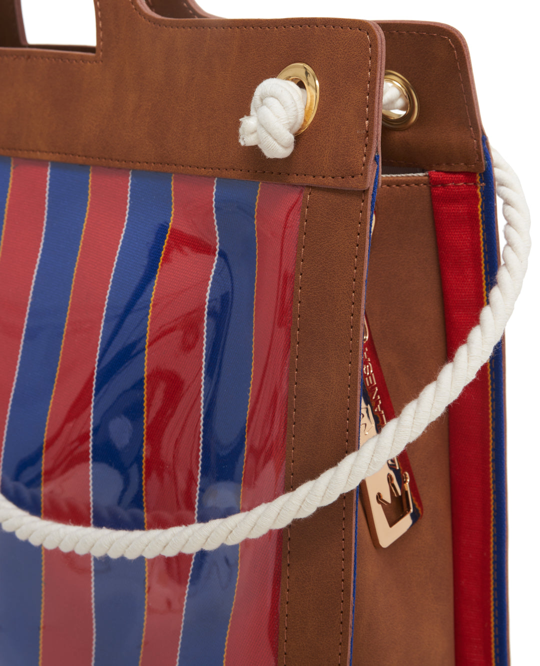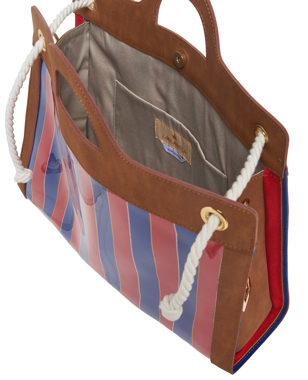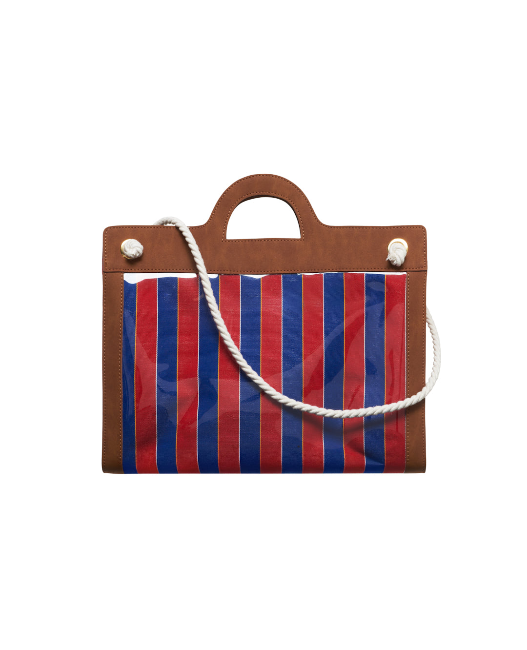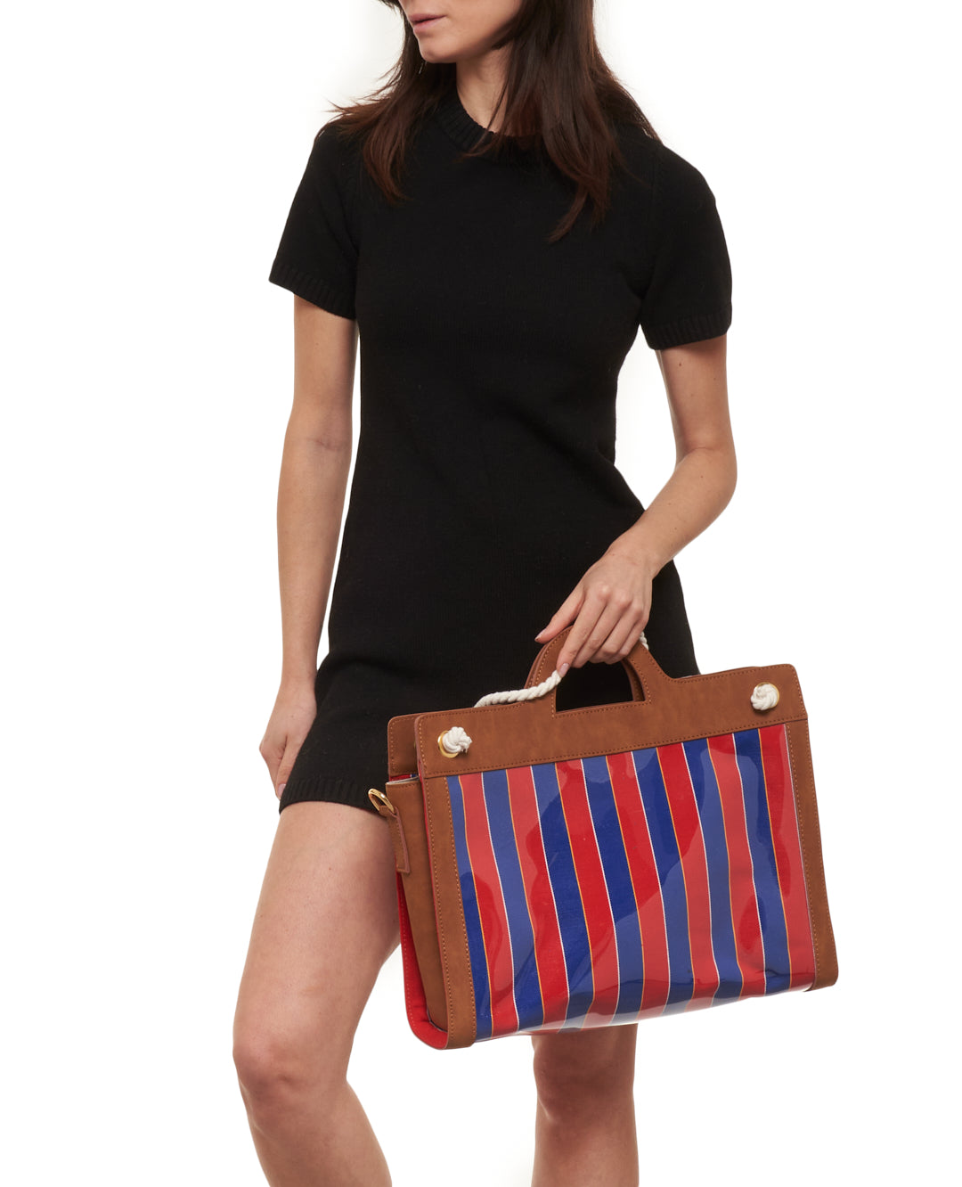 A structured bag with vertical stripes in cool tones, featuring a clean, modern design. The rigid handle and rope shoulder strap add functionality and style, making it ideal for those seeking a practical yet bold accessory.