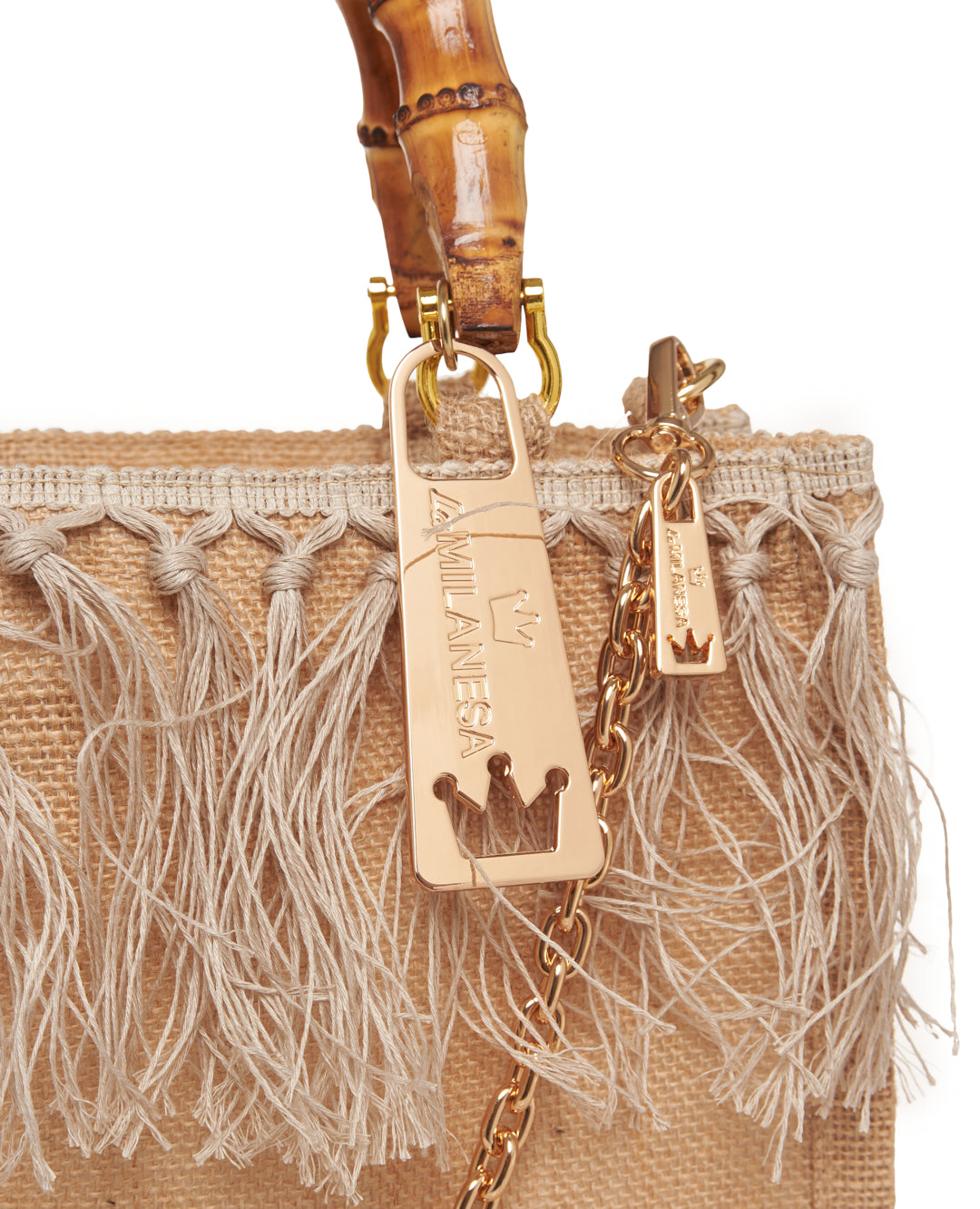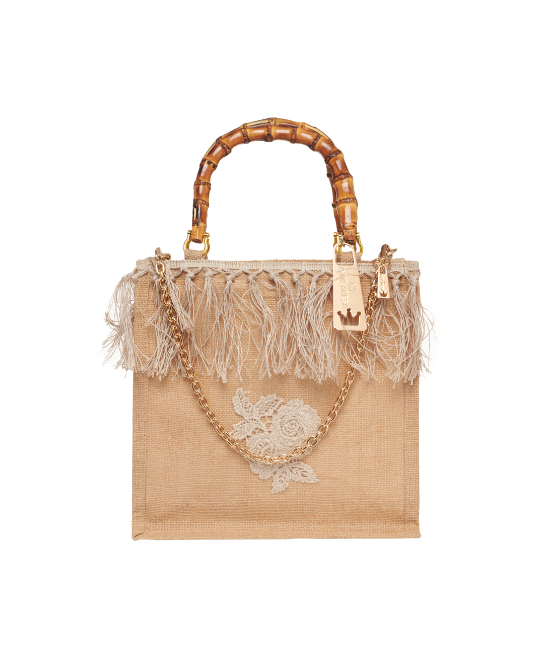 Mini jute bag with crochet details and decorative fringes, designed for those who love accessories with a strong artisanal feel. The bamboo-effect handle and metal chain complete a refined and original design, ideal for sophisticated summer looks.