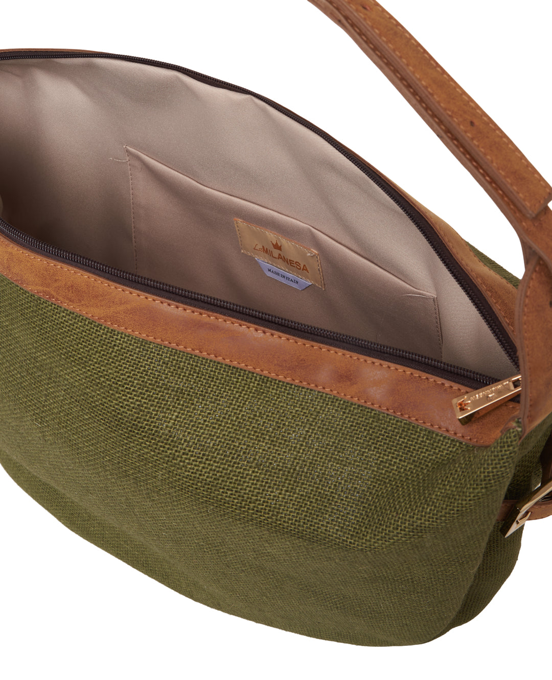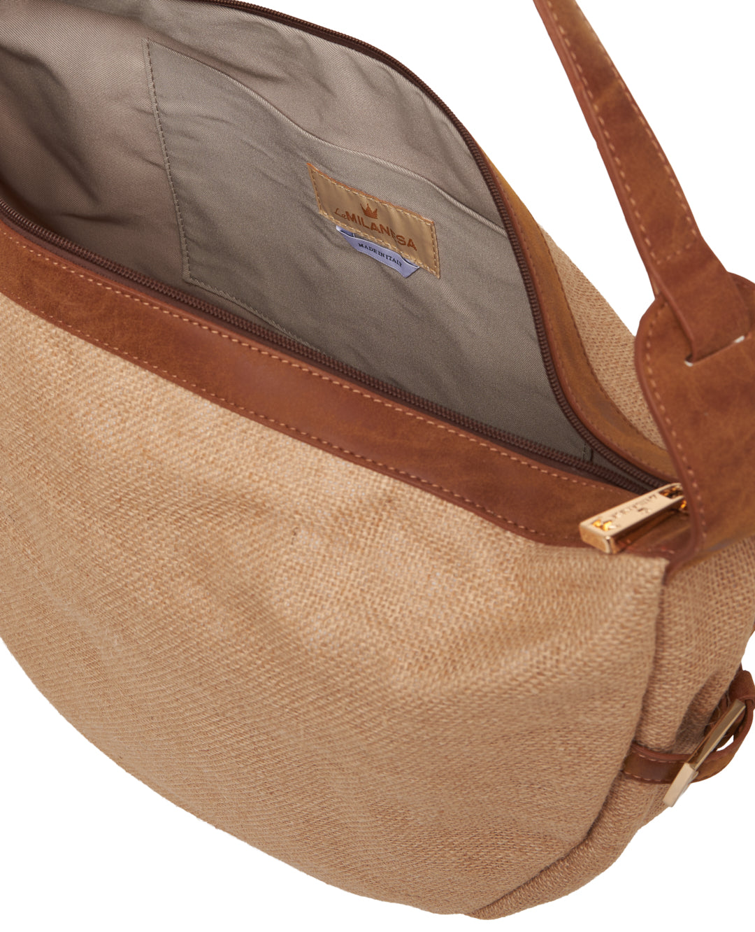 Borsa a spalla in tessuto naturale – Sabbia Linea morbida ed essenziale, realizzata in tessuto naturale color sabbia. Chiusura con zip e tracolla regolabile, ideale per l’uso quotidiano.