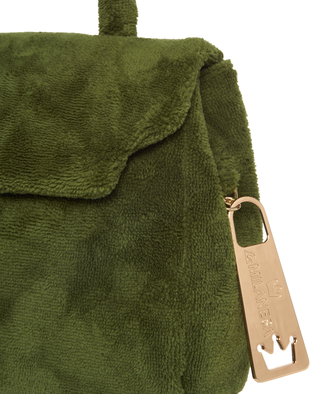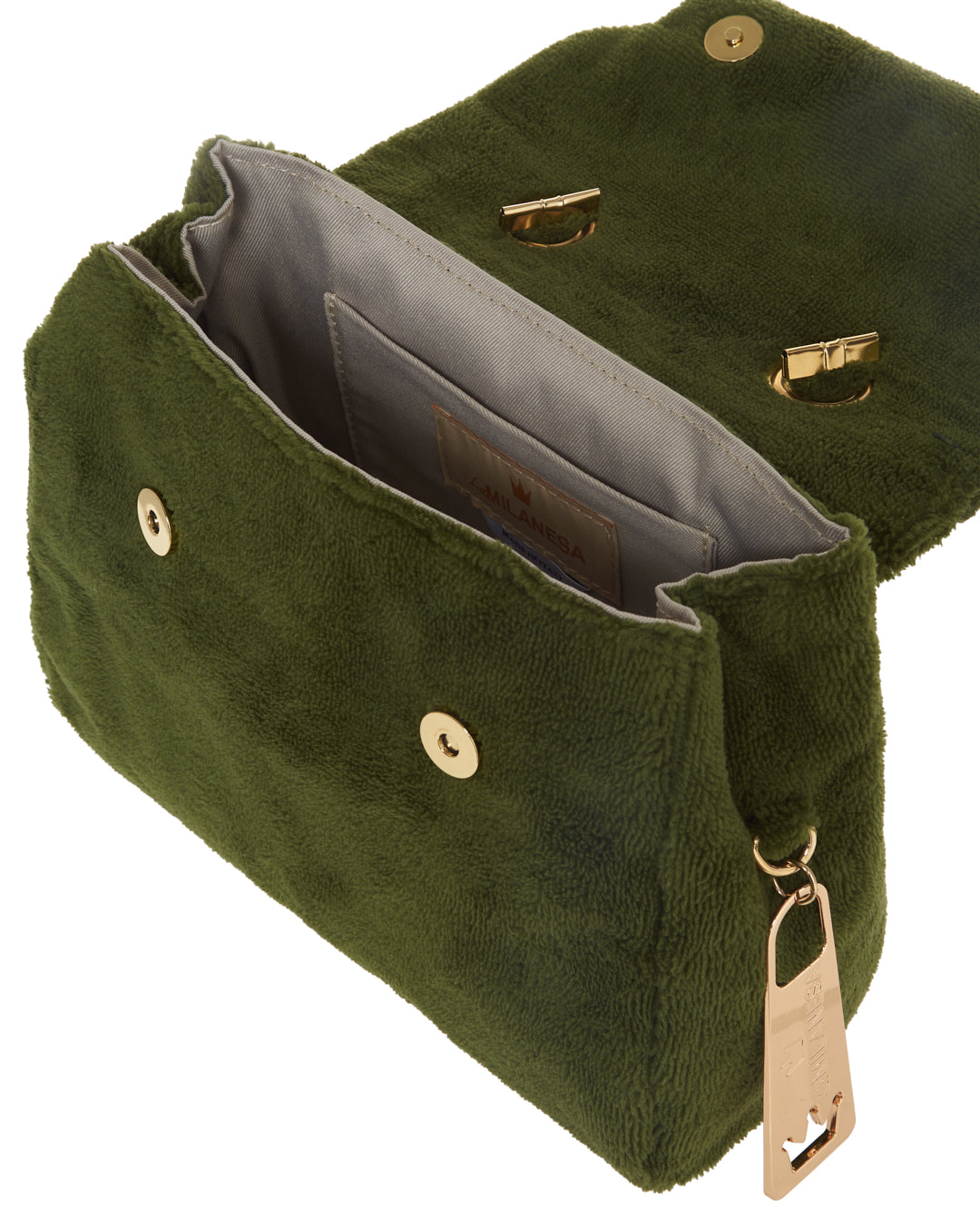 Borsa a mano in tessuto effetto teddy – Verde oliva Borsa compatta e morbida in tessuto effetto teddy, con patta frontale e manico superiore. Il colore verde oliva dona un tocco contemporaneo e raffinato. Ideale per: look urbani, stagioni fredde, outfit casual chic.