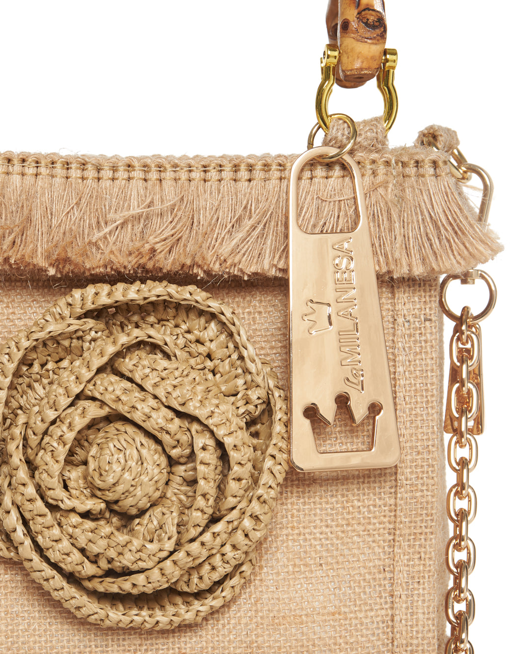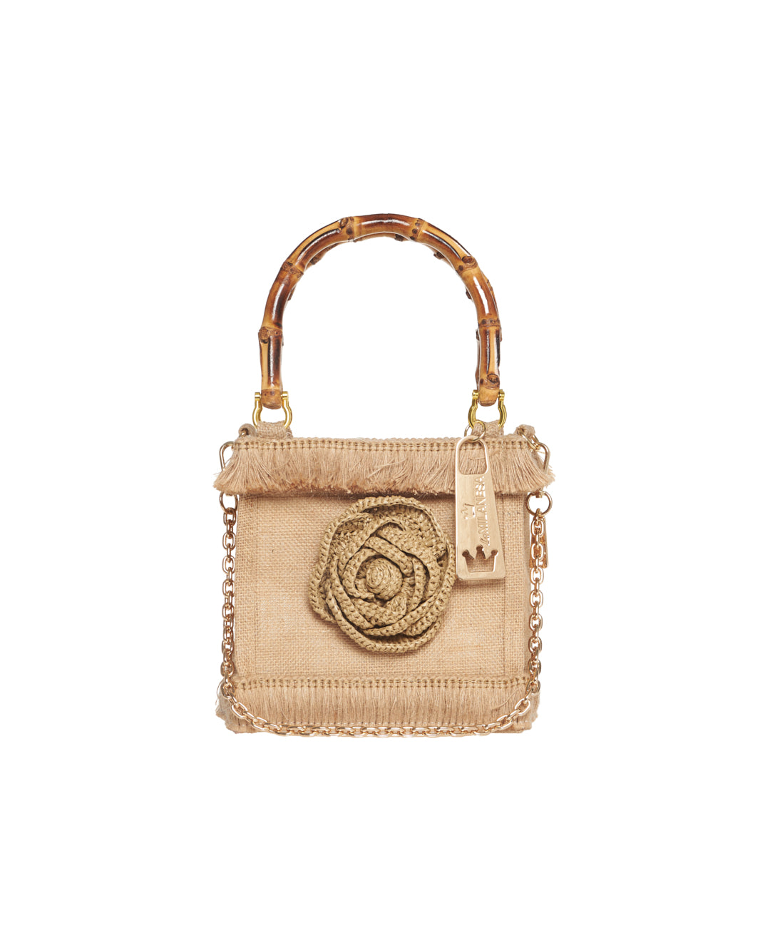 Mini borsa dallo stile artigianale, realizzata in tessuto naturale con frange decorative e applicazione floreale centrale in rafia. Il manico rigido in bamboo e la catena dorata aggiungono un tocco elegante e ricercato. Ideale per: occasioni estive, look romantici, outfit boho-chic.