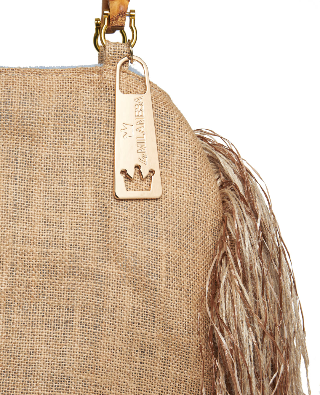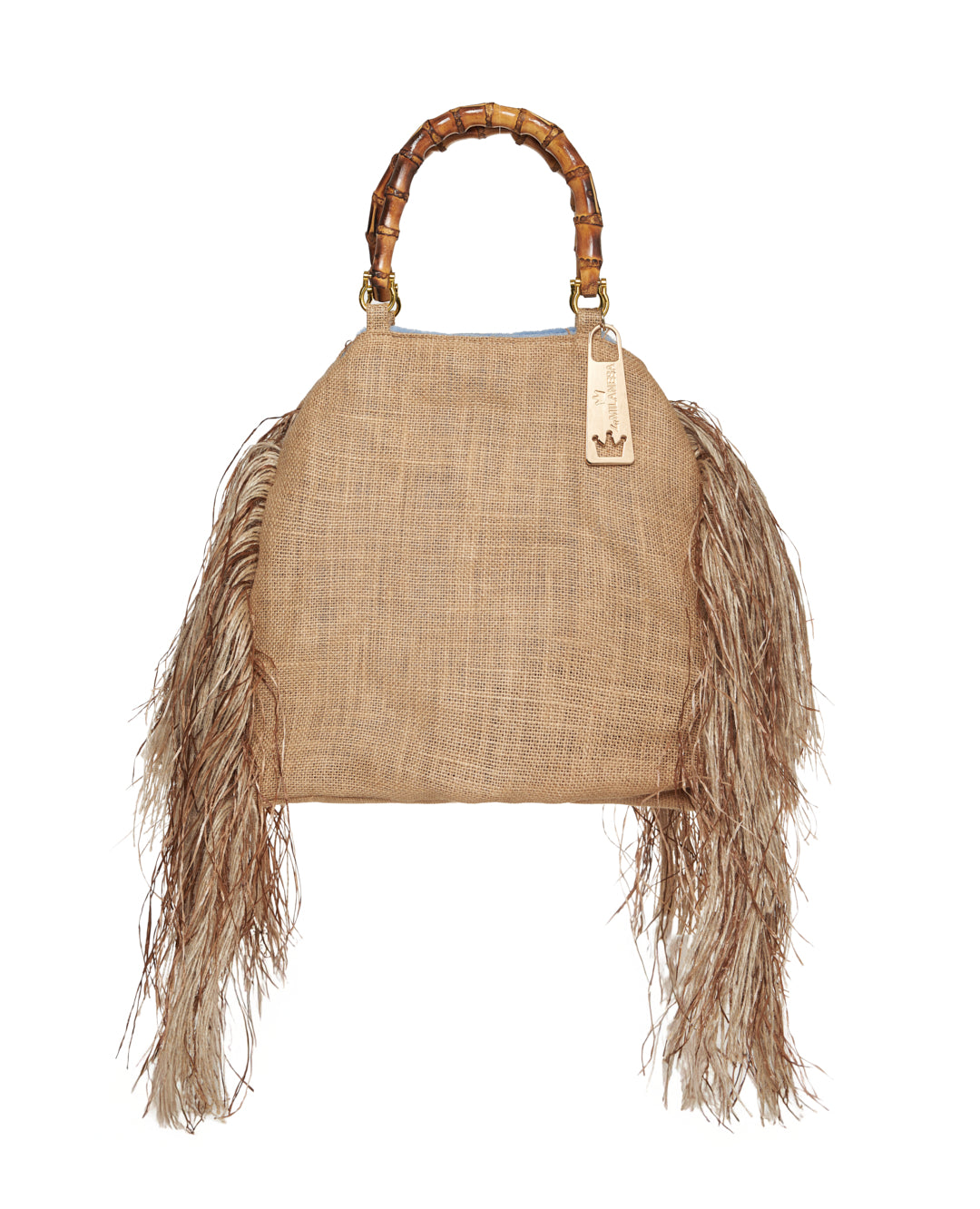 Borsa a mano in tessuto naturale con frange laterali lunghe, caratterizzata da una silhouette morbida e da un manico effetto bamboo. Lo stile boho ed elegante la rende un accessorio ideale per la stagione estiva e per outfit rilassati ma curati.
