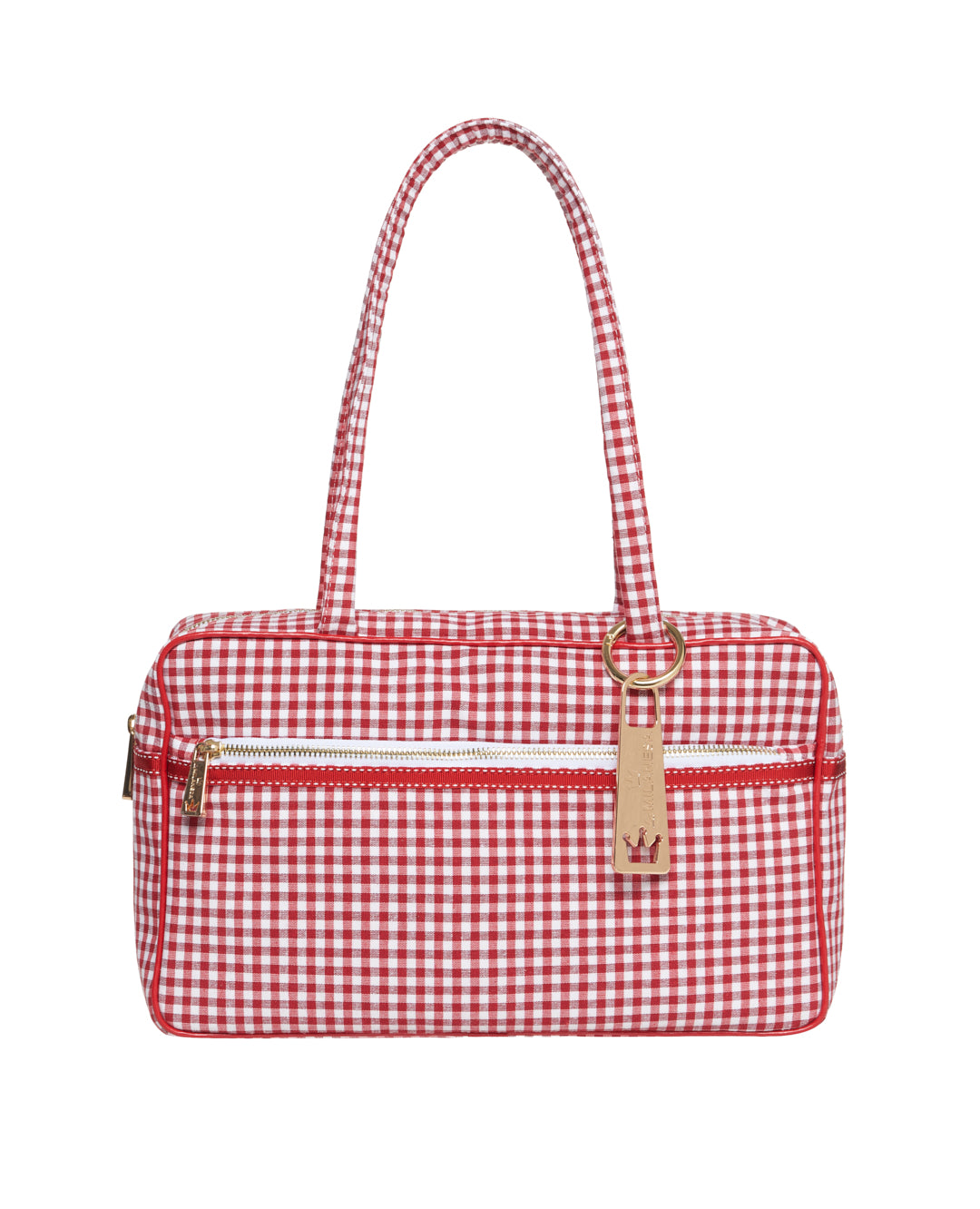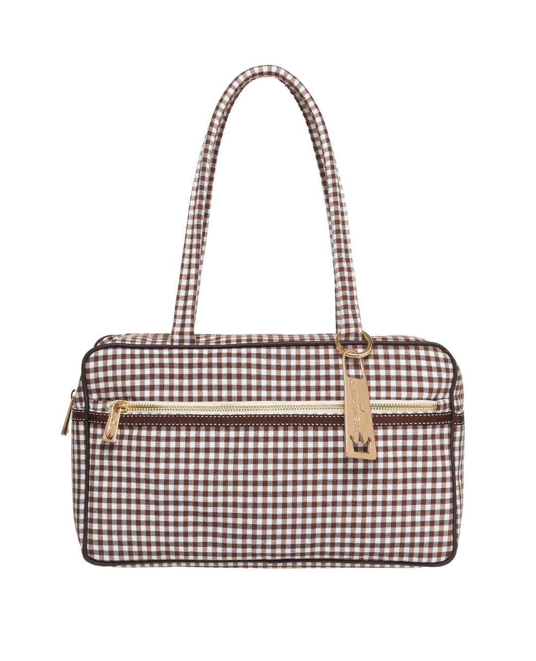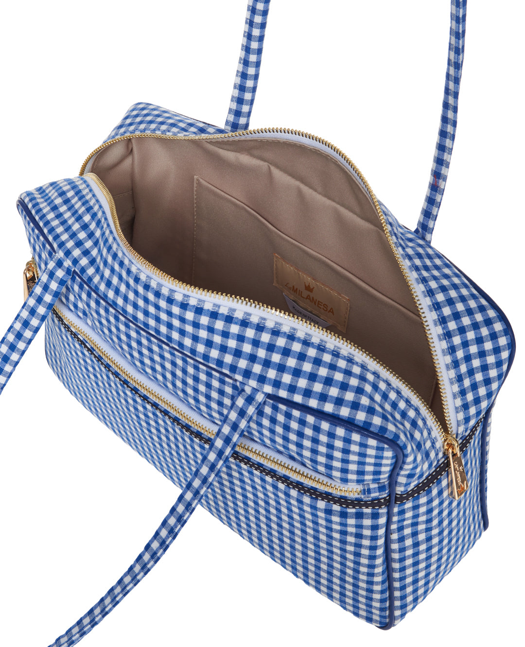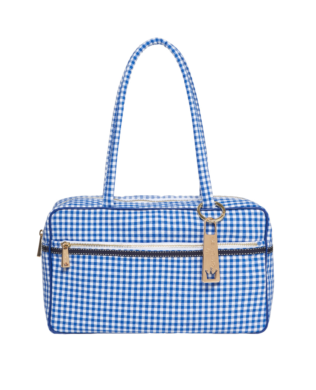 Borsa a spalla in tessuto a quadretti blu, caratterizzata da una silhouette allungata e contemporanea. La doppia zip frontale e il charm metallico aggiungono funzionalità e stile, rendendola perfetta per l’uso quotidiano. Un accessorio pratico e femminile, ideale per look casual chic.