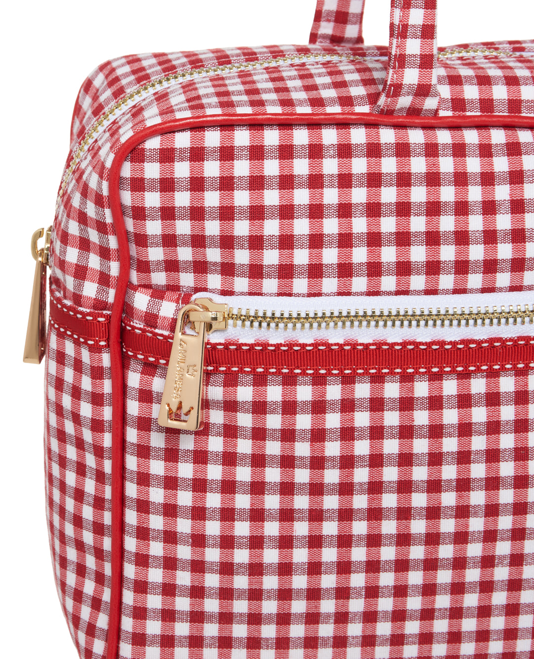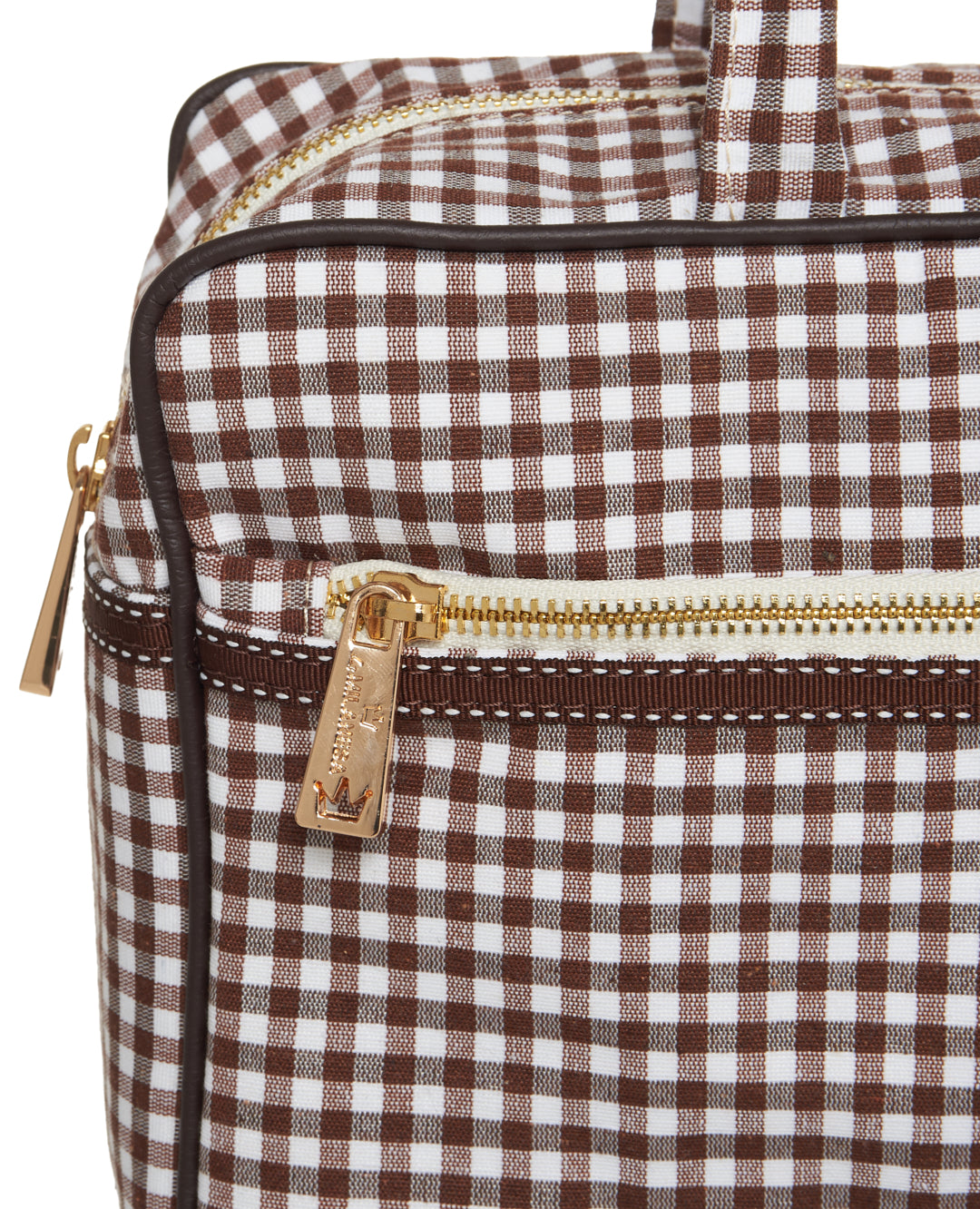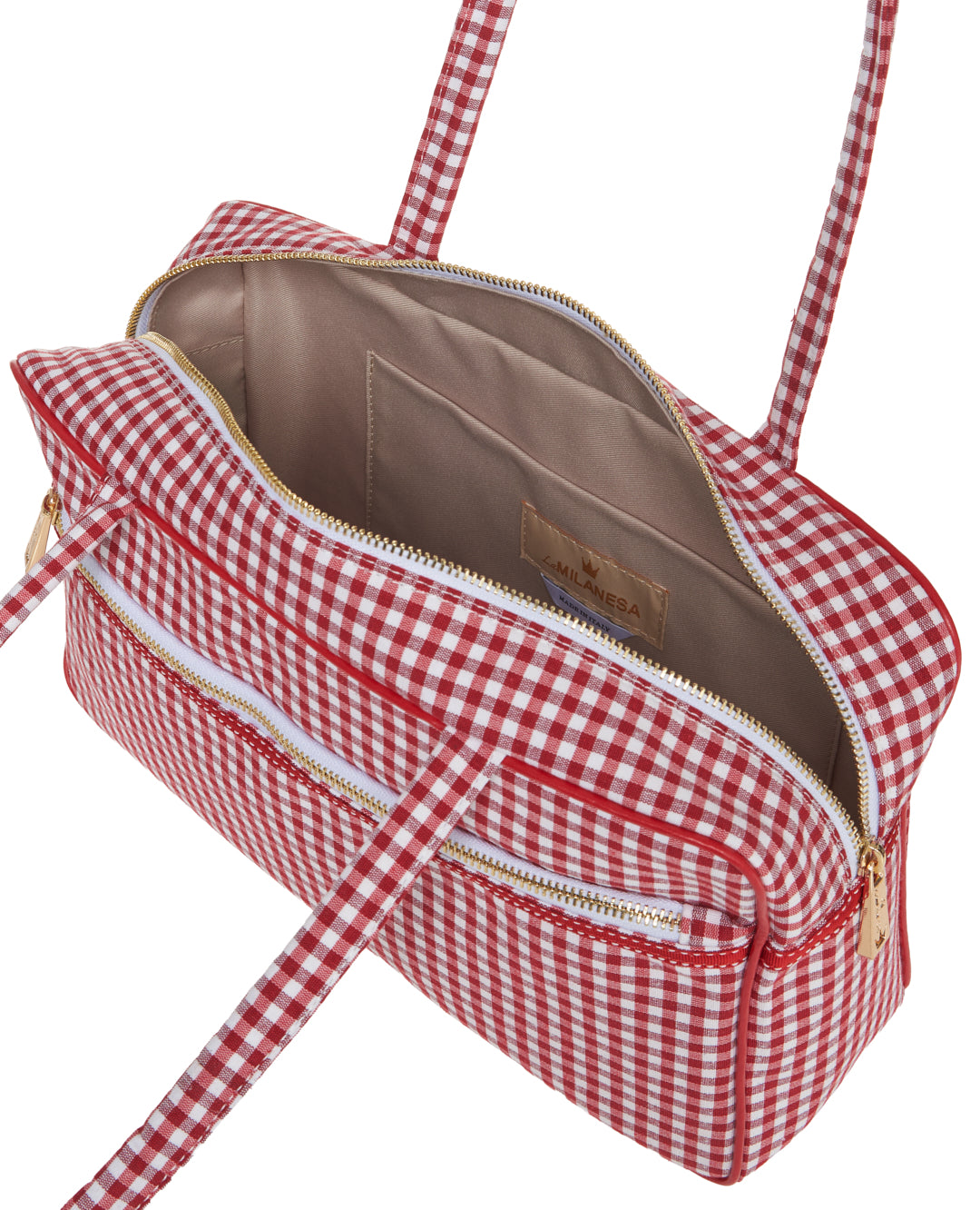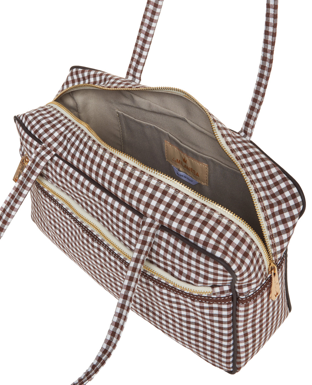 Borsa a spalla in tessuto a quadretti blu, caratterizzata da una silhouette allungata e contemporanea. La doppia zip frontale e il charm metallico aggiungono funzionalità e stile, rendendola perfetta per l’uso quotidiano. Un accessorio pratico e femminile, ideale per look casual chic.